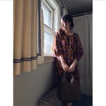 Made of a lovely cotton sateen, this is a dreamy midi length raglan smock dress with side seam pockets. Colors include shades of brown, purple and gold.