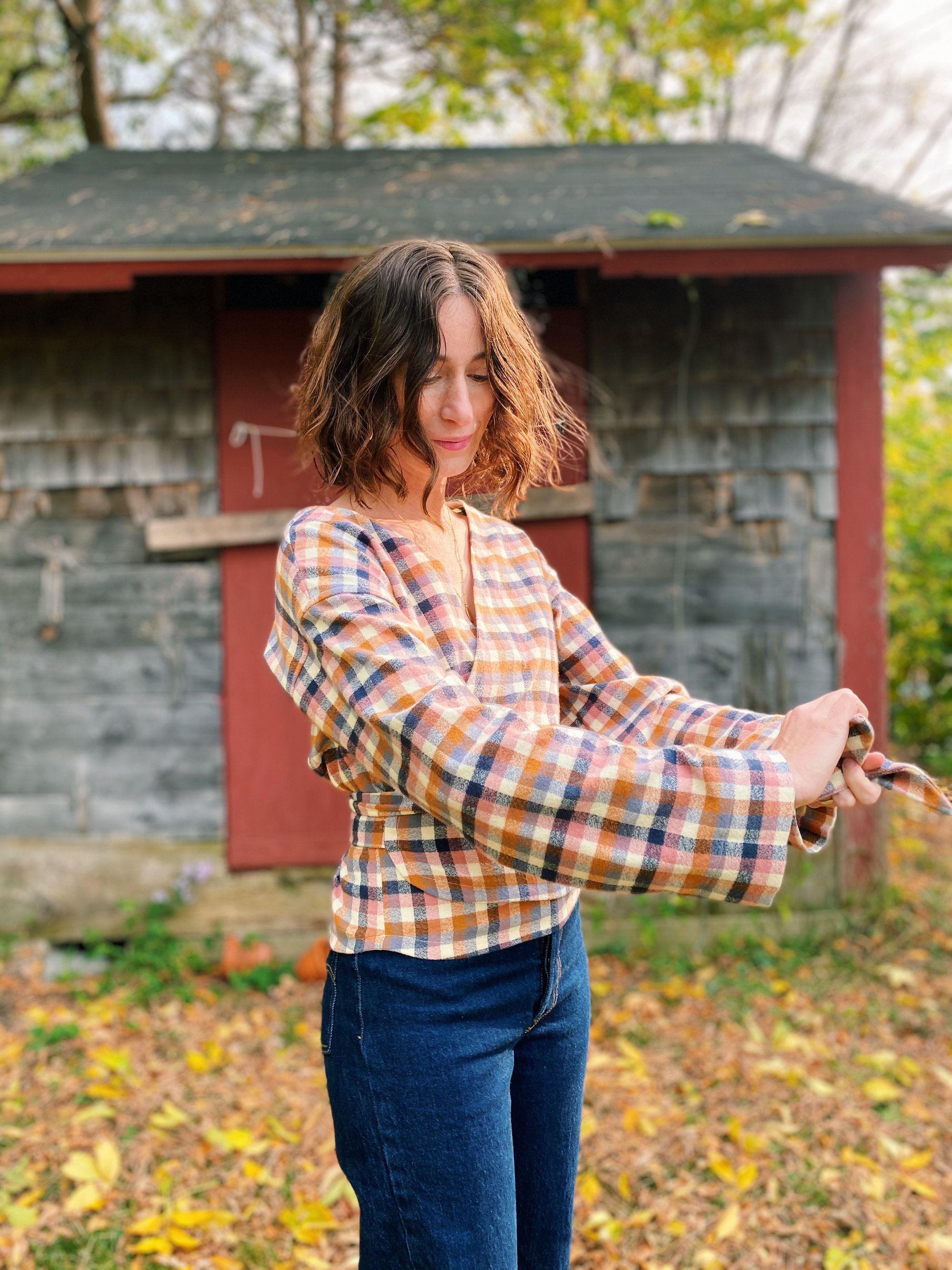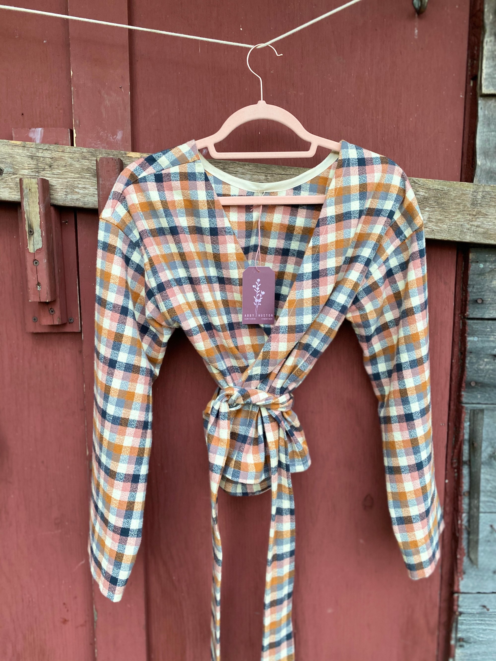 An instant classic. Soft, double-brushed 100% cotton wrap top with dropped shoulder and attached waist ties and side slit opening. Wear with wrap in front or back.