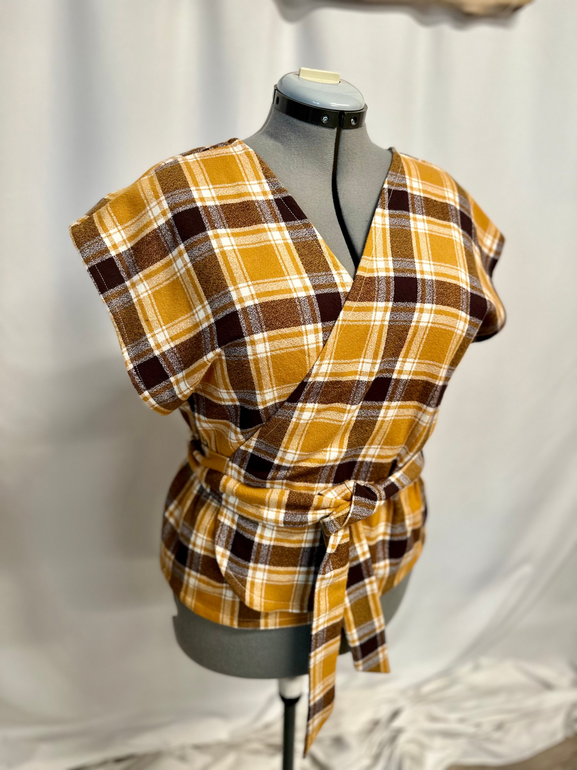 An instant classic. Soft, double-brushed 100% cotton wrap top with dropped shoulder and attached waist ties and side slit opening. Wear with wrap in front or back. Colors are gold, deep brown and cream.
