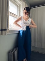 Made with the same pattern as my ‘coat pants’ from earlier this year, this rustic weight indigo linen pair is more fluid and breezy. I’ve done this pair with a slightly cropped leg. Hits my 5’7” frame at the ankle. Waistband is a wide, stretchy elastic and leg shape is wide but with a slight barrel curve. Finished with two angled patch pockets in back that use the selvedge edge of the fabric.