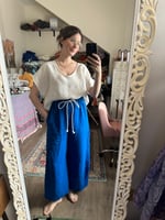 Made out of a stunning lightweight linen in white, this tee has an oversized, easy feel. The fit is boxy and slightly cropped and can be worn tucked or out.