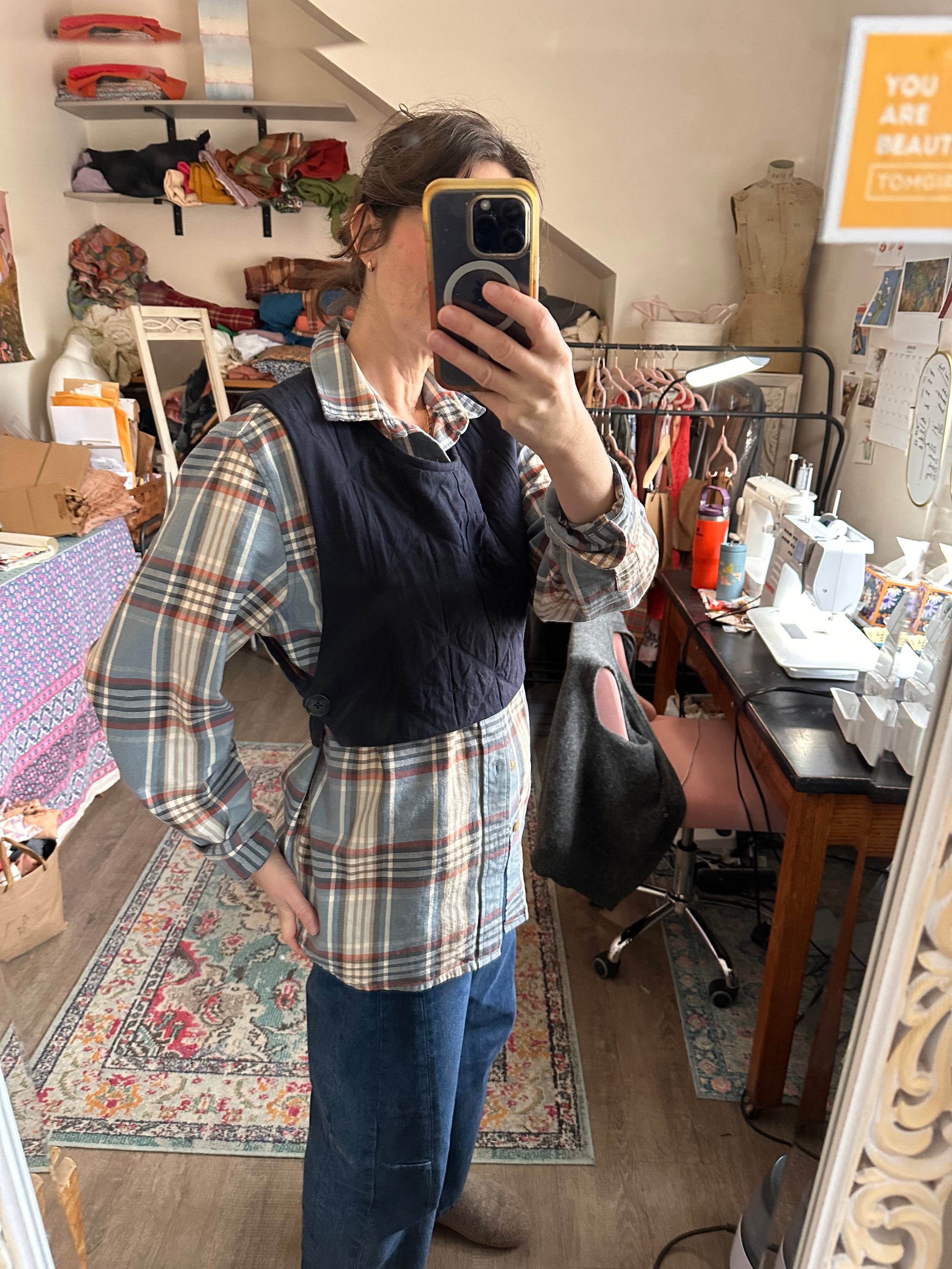 Made in a squishy navy BCI cotton jacquard and lined in a deadstock cotton flannel in colors gold, navy and burgundy this vest pops over the head and buttons at natural waist. Vintage buttons.