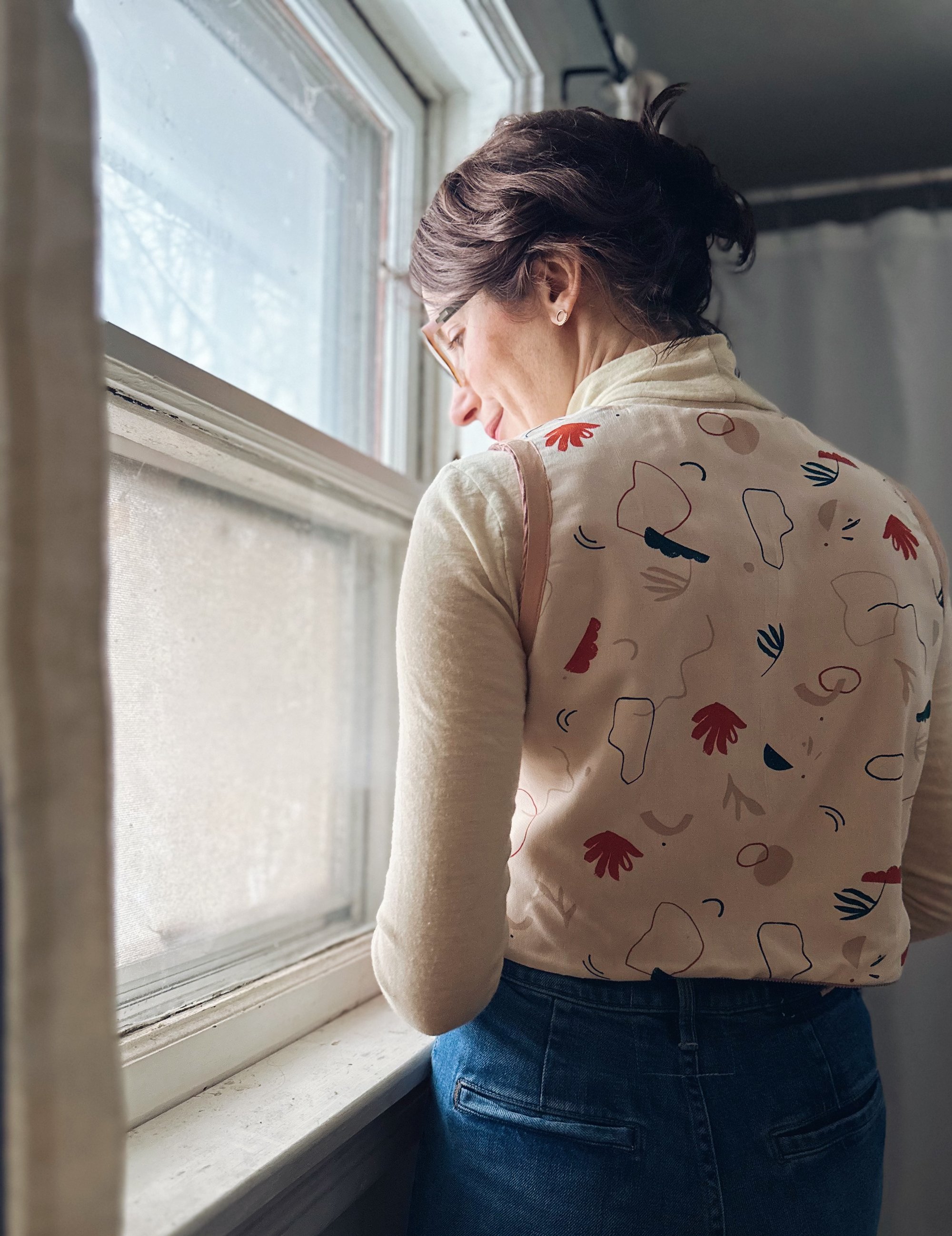 Made in a soft rose cotton corduroy and a modern viscose print, this fully reversible vest closes with two sets of rose viscose ties for an adjustable fit.