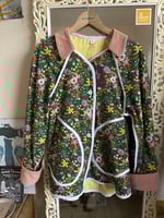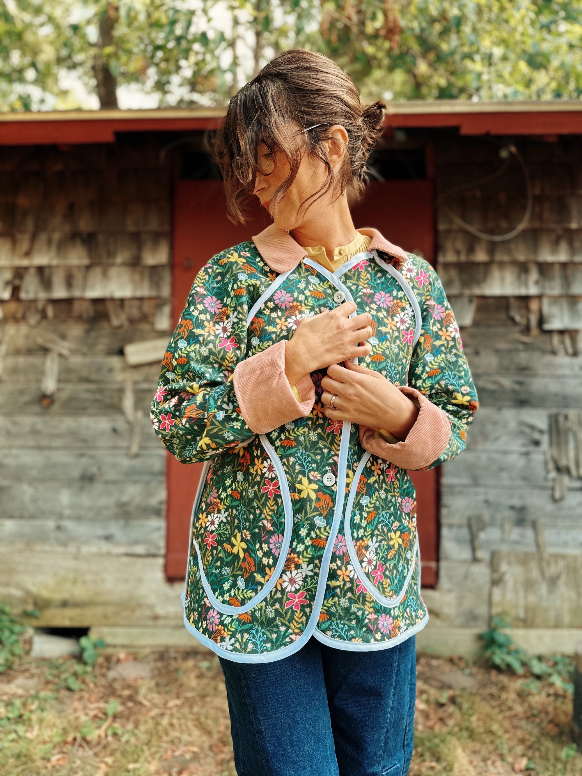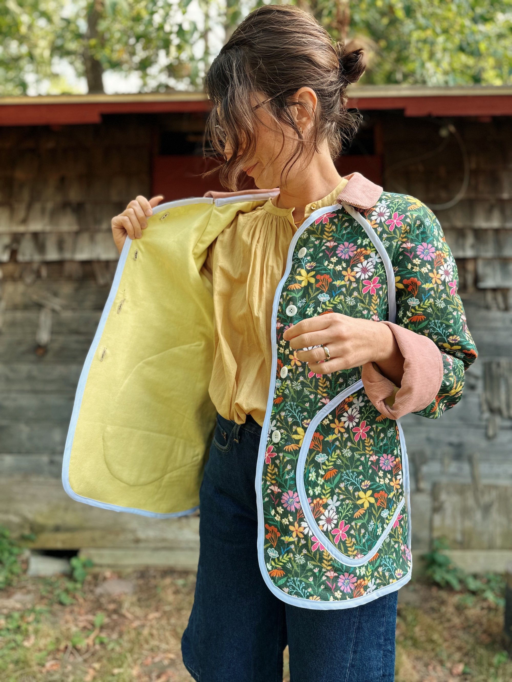 100% linen outer layer with a lightweight yellow brushed cotton lining and ballet pink cotton corduroy accents, it features raglan sleeves and D shaped patch pockets.