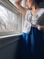 Made from a vintage white linen textile with hand embroidery in shades of mustard and indigo, this blouse fastens with two sweet yellow buttons at the bust. Two small side slits at the hemline help keep this easy breezy.
